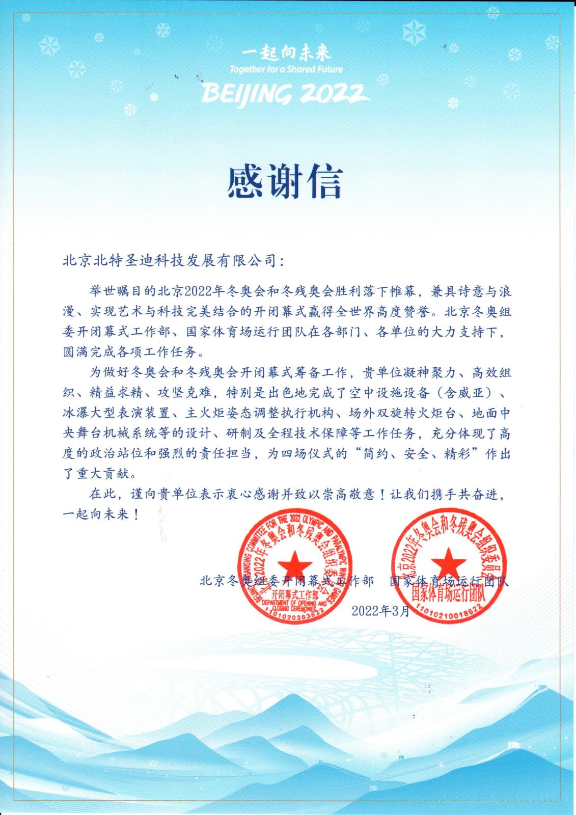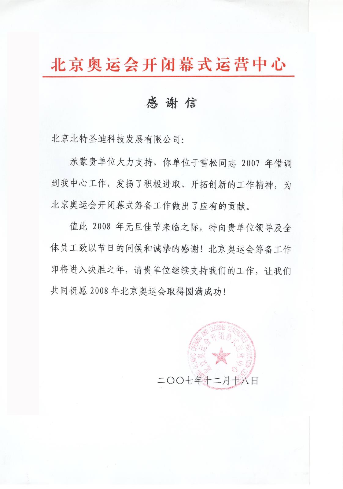 北京奧運會開閉幕式籌備工作感謝信(于雪松)