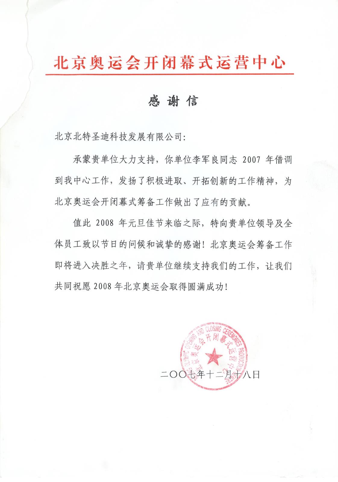 北京奧運會開閉幕式籌備工作感謝信(李軍良)