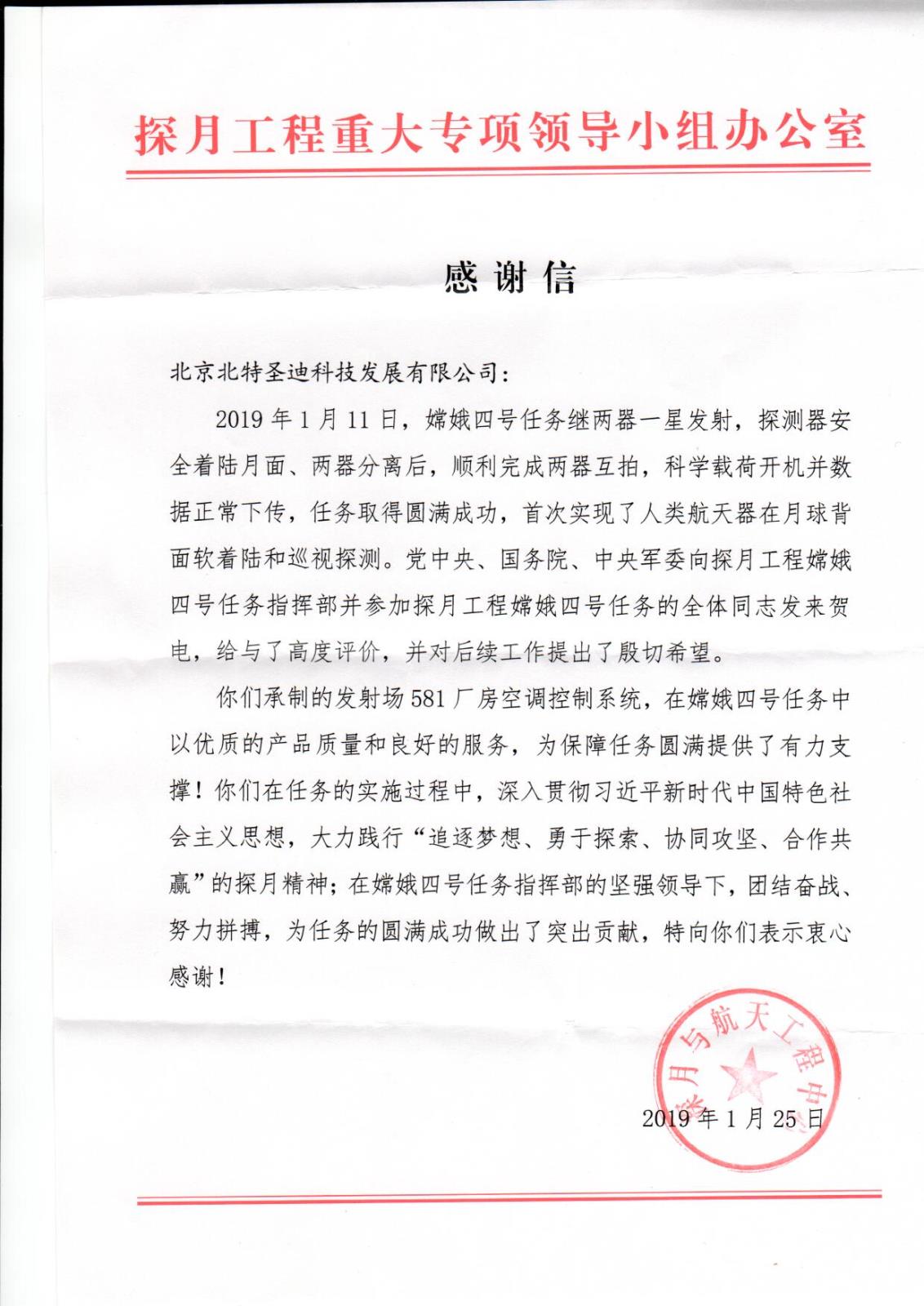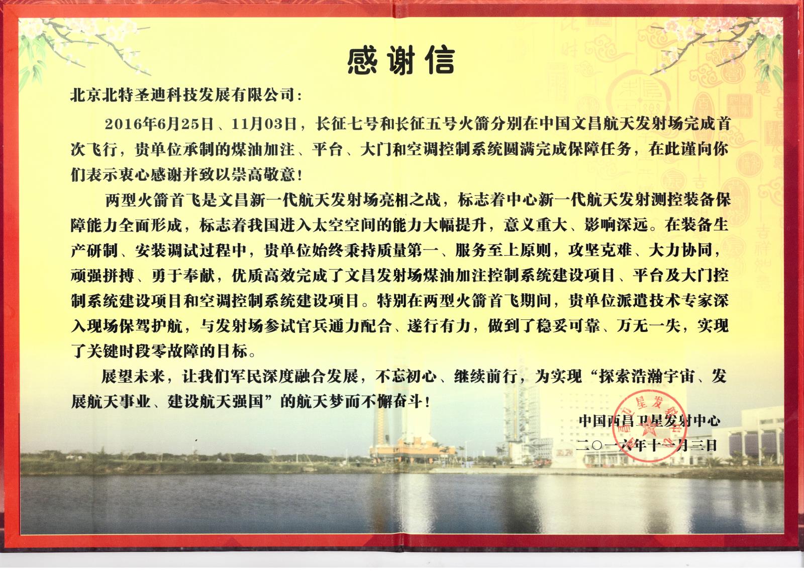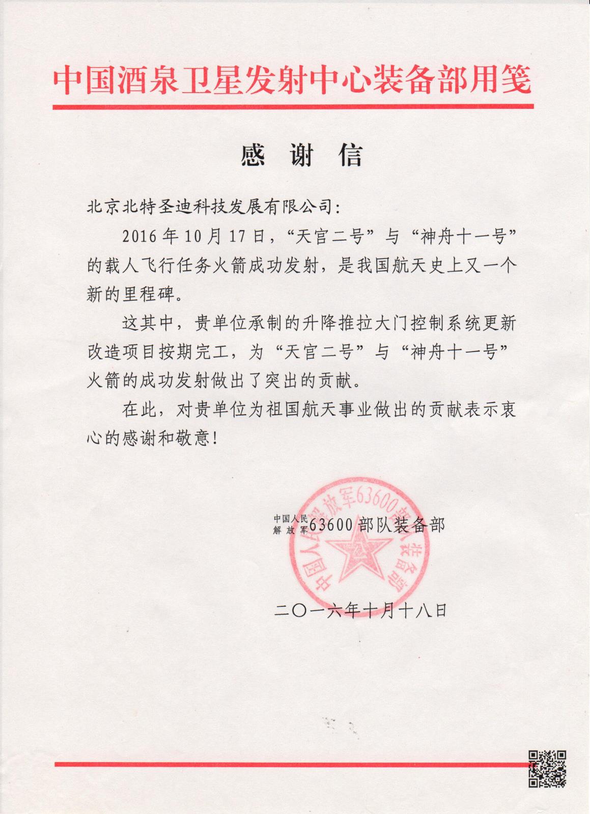 酒泉衛(wèi)星發(fā)射中心“天宮二號”與“神舟十一號”發(fā)射感謝信