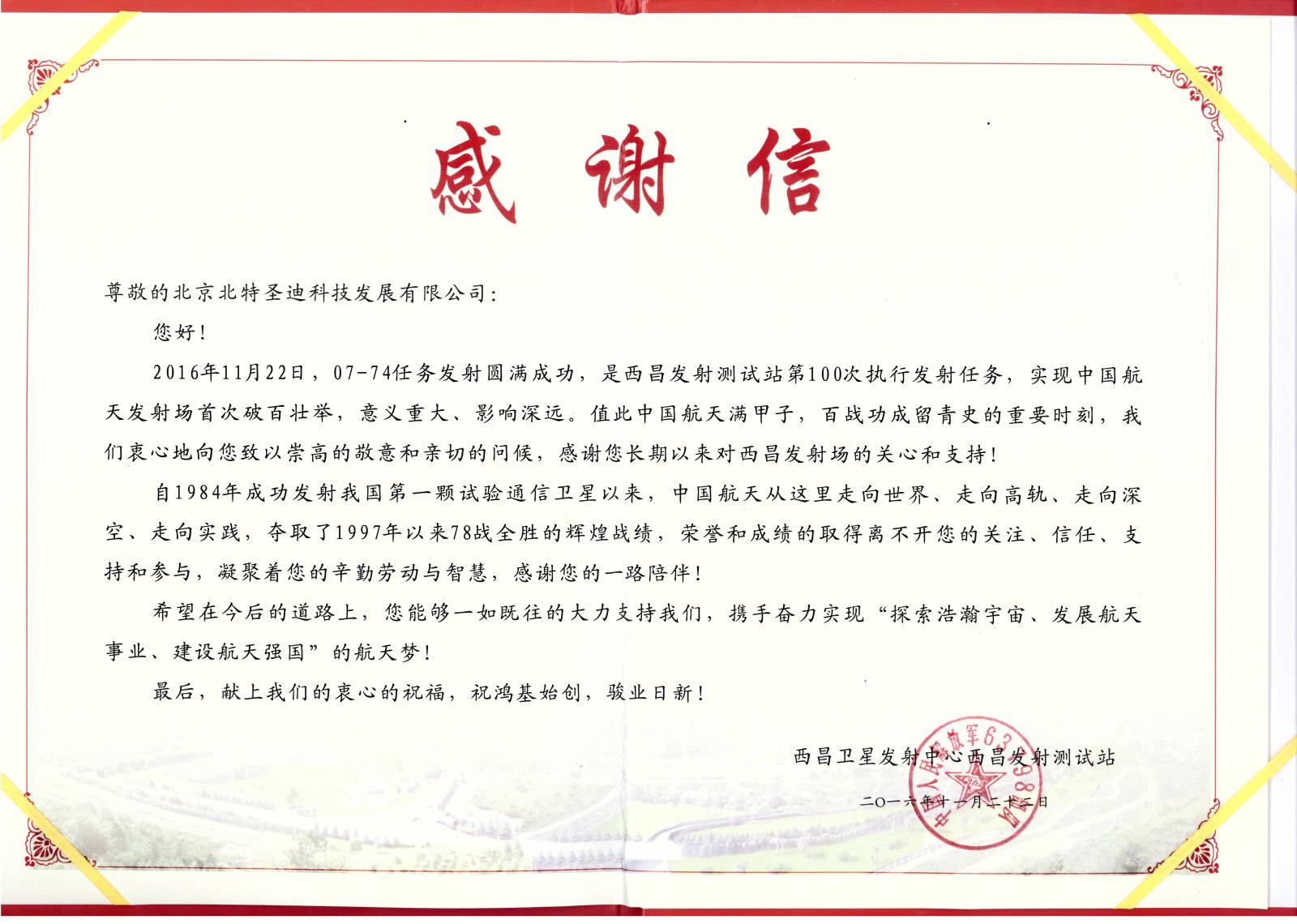西昌發(fā)射測試站第100次發(fā)射任務(wù)感謝信