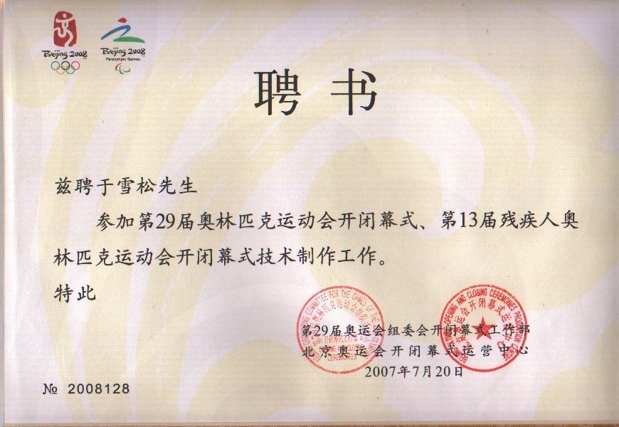 2008第二十九屆北京奧運會、殘奧會聘書-于雪松