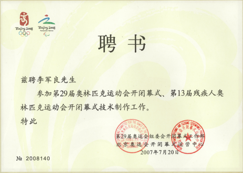 2008第二十九屆北京奧運會、殘奧會聘書-李軍良