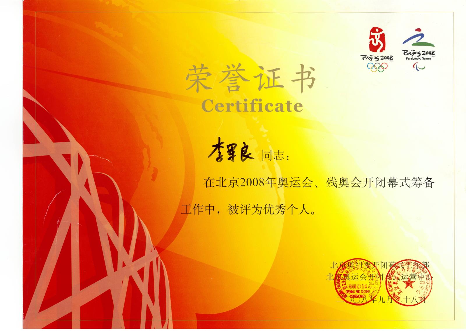2008北京奧運會、殘奧會優(yōu)秀個人榮譽證書-李軍良