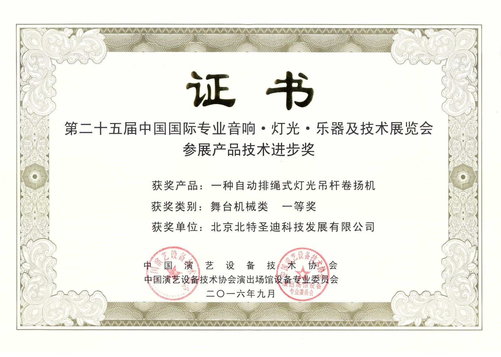 2016第二十五屆PALM展產(chǎn)品技術(shù)進步獎-一種自動排繩式燈光吊桿卷揚機-舞臺機械一等獎