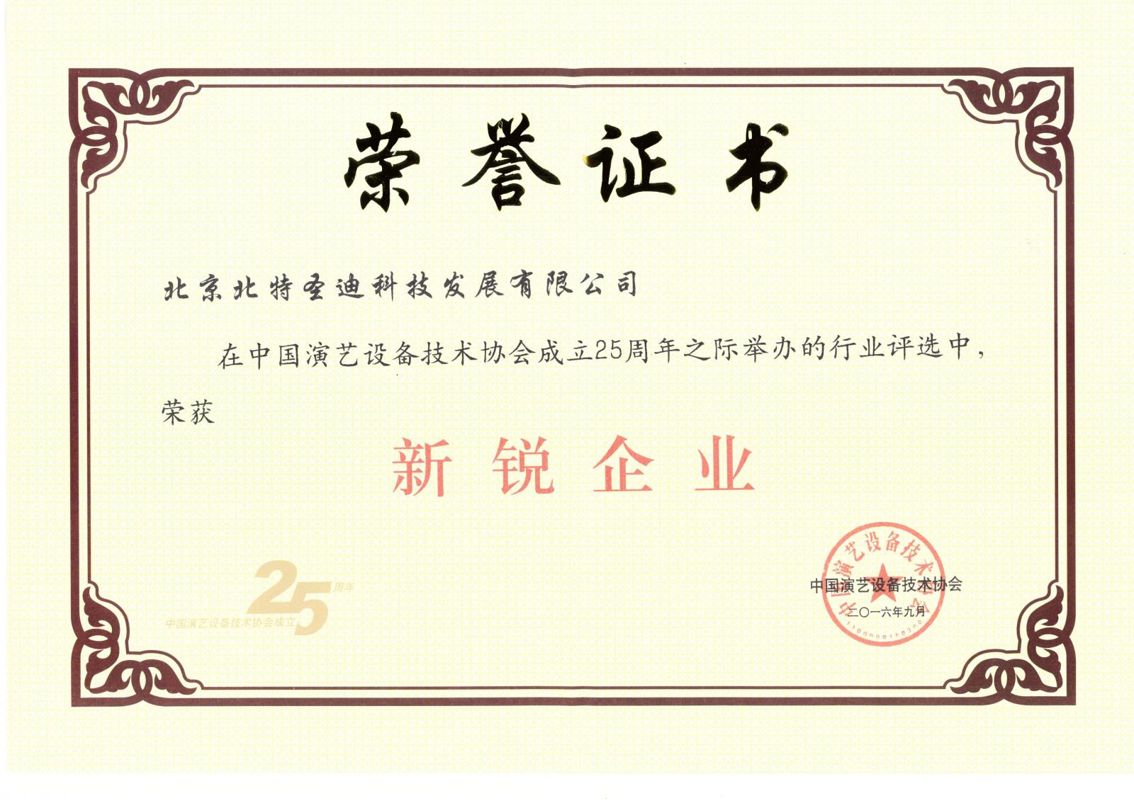 2016中國演藝設(shè)備技術(shù)協(xié)會成立二十五周年新銳企業(yè)榮譽證書