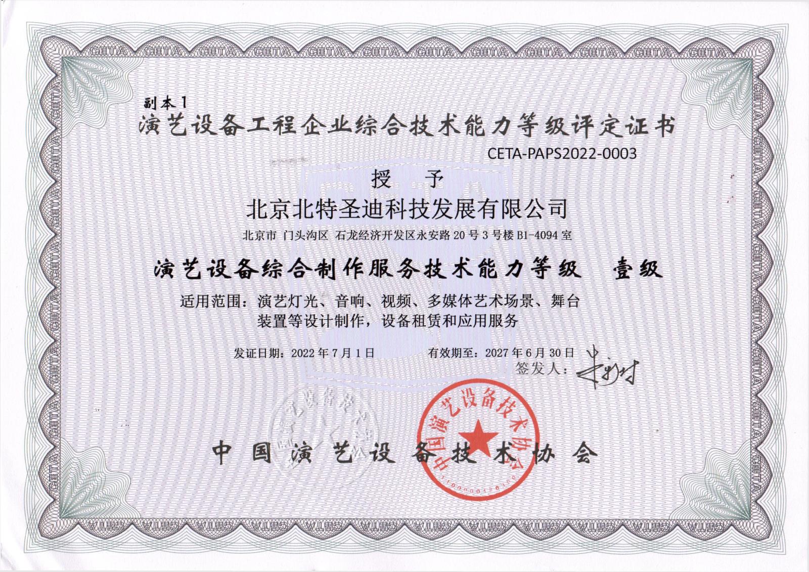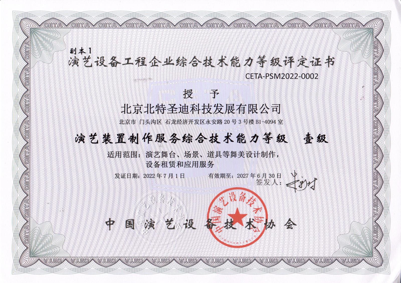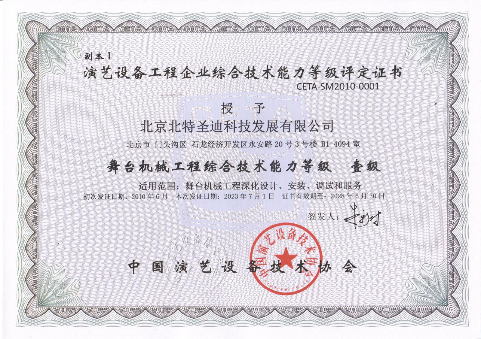演藝設(shè)備工程企業(yè)舞臺機械工程 綜合技術(shù)能力等級壹級證書