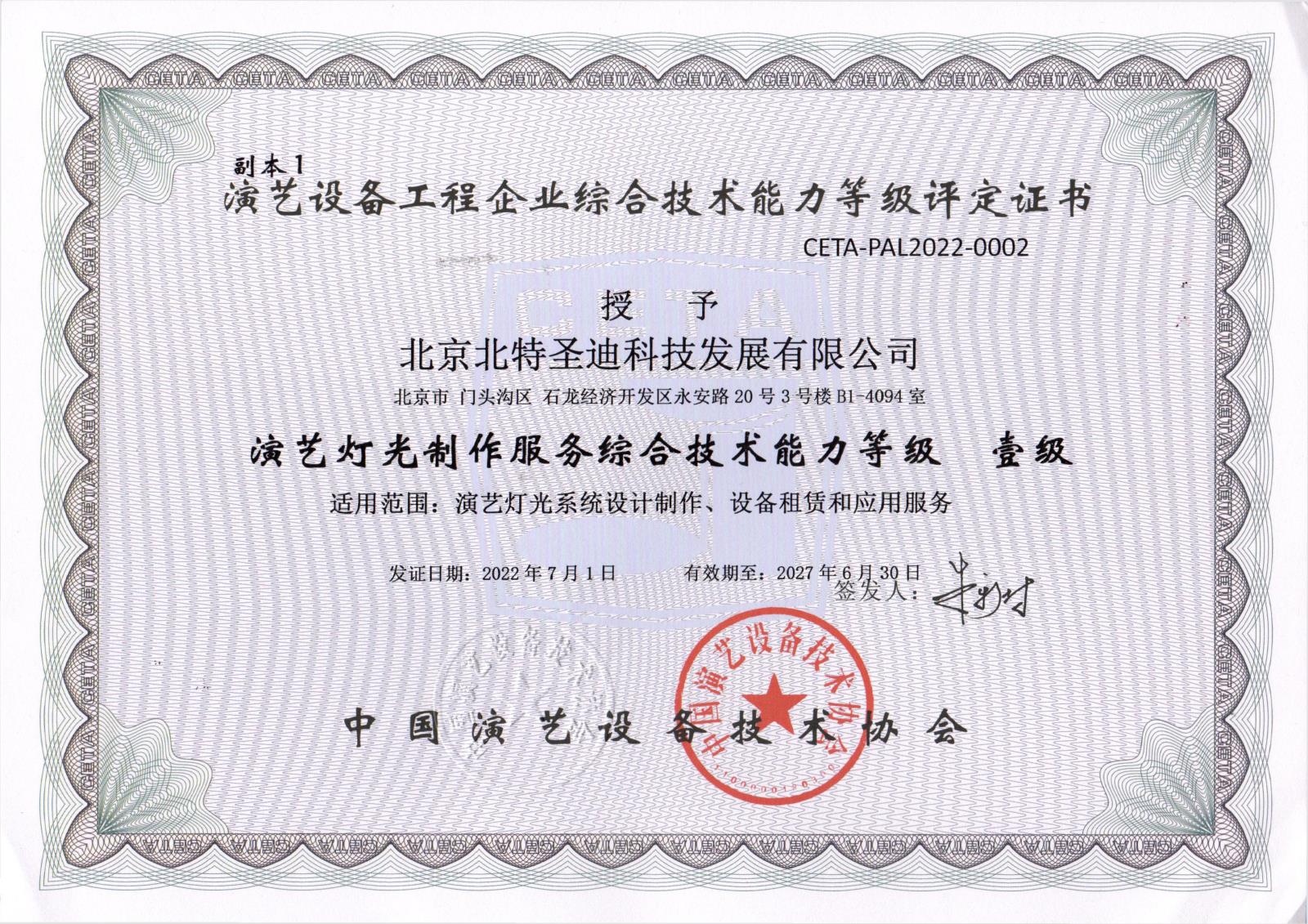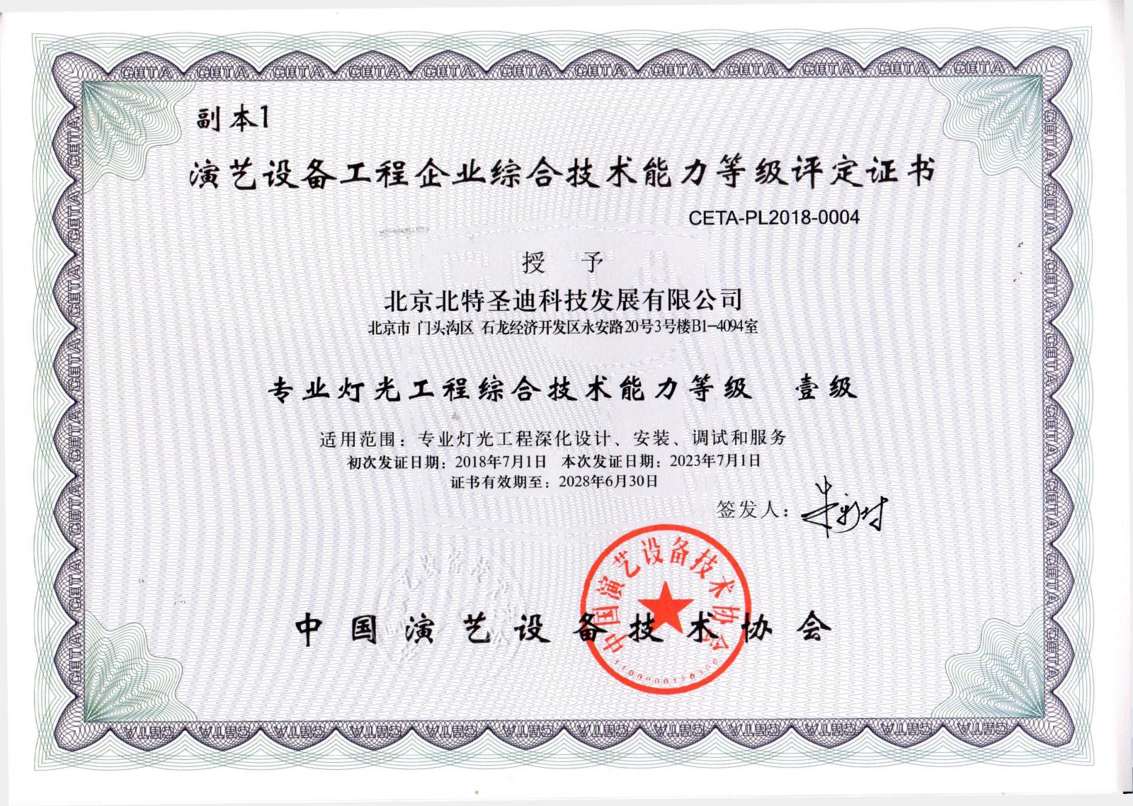 演藝設(shè)備工程企業(yè)專業(yè)燈光工程 綜合技術(shù)能力等級壹級證書