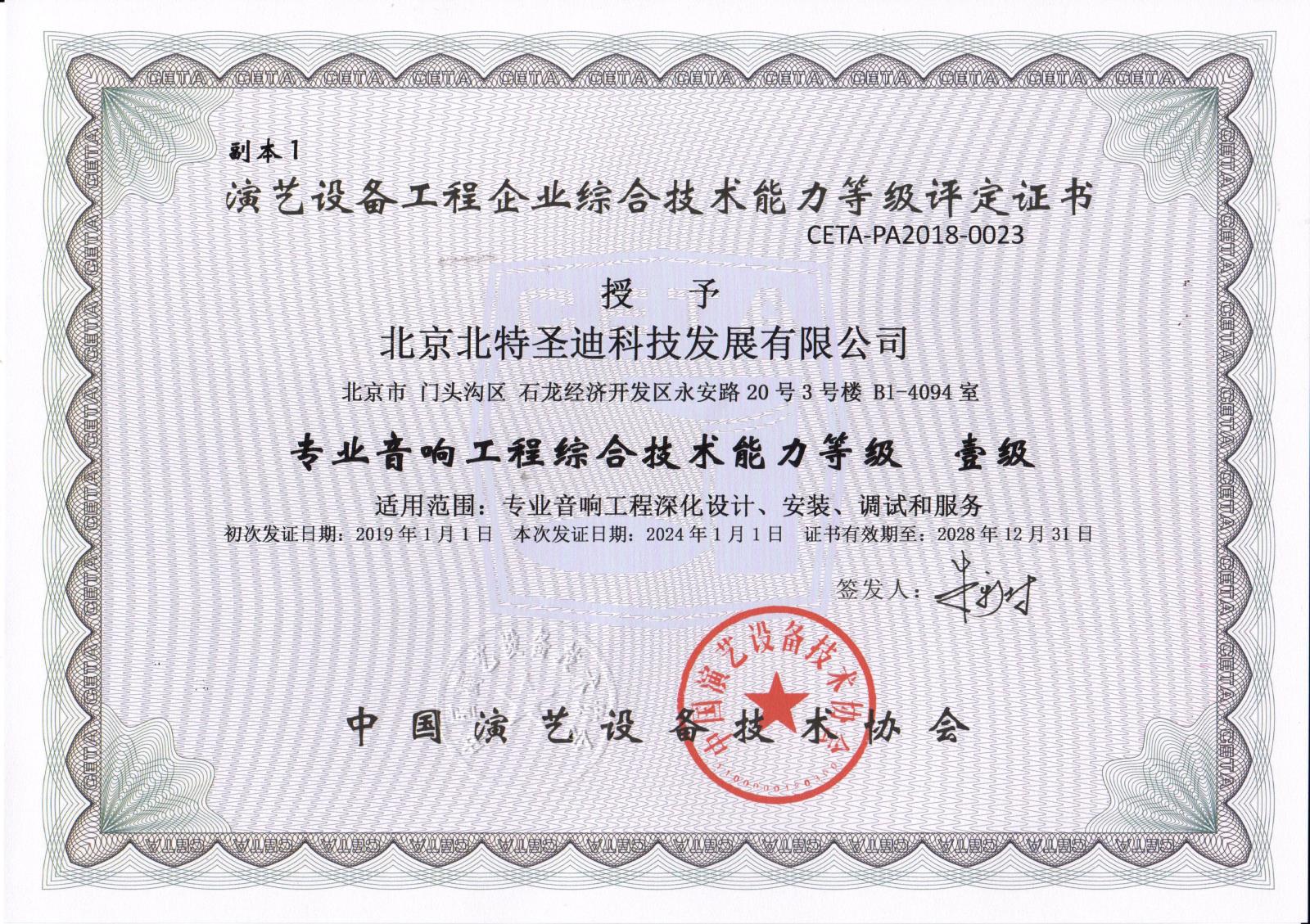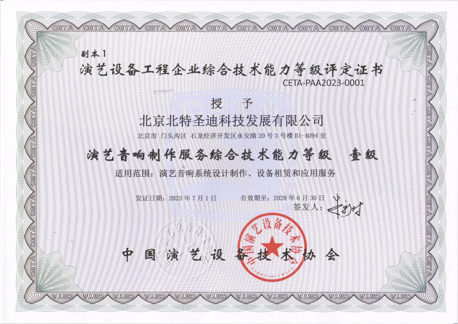 演藝設(shè)備工程企業(yè)專業(yè)音響工程 綜合技術(shù)能力等級壹級證書