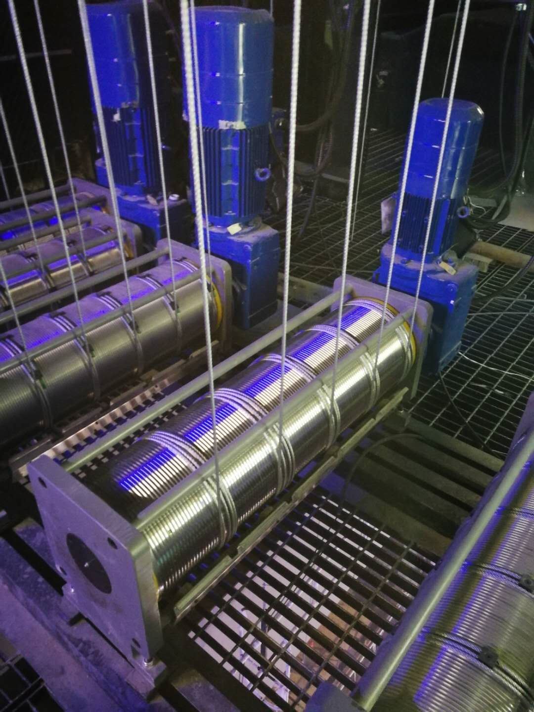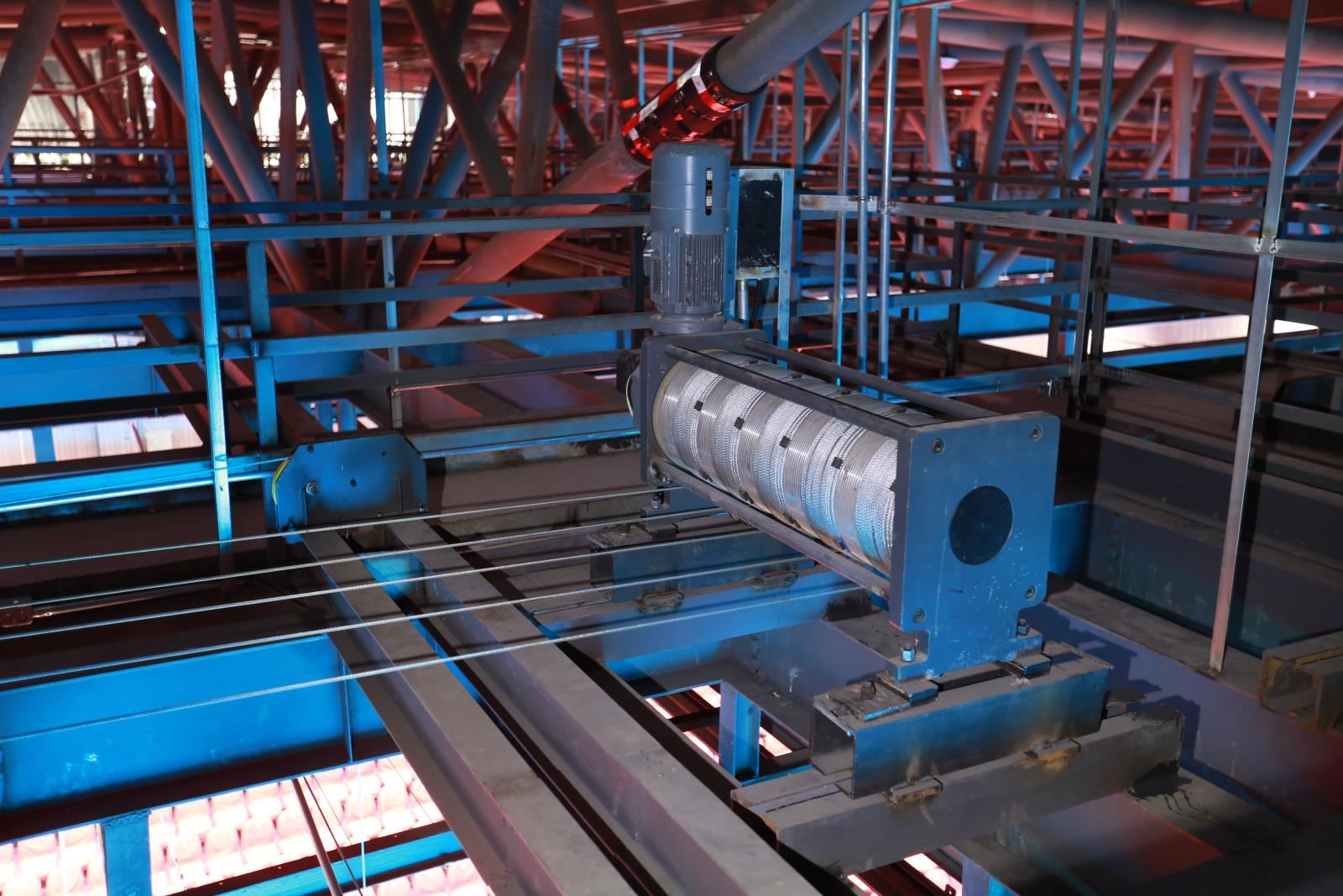 鋼絲繩路徑:鋼絲繩從卷筒引出到滑輪組的轉向滑輪,由此引向燈架(桿體)。鋼絲繩通過其他燈架中的轉向滑輪再次轉向,經過柵頂下方,在此固定在鋼結構上。含必要的轉向滑輪。