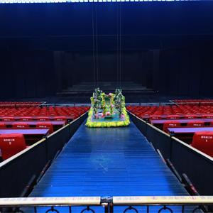 軌道根據(jù)演出創(chuàng)意和使用需求不同,可以為直線,也可以是不規(guī)則曲面弧線導(dǎo)軌(需考慮平移裝置最小轉(zhuǎn)彎半徑);平移一般采用自適應(yīng)摩擦輪傳動方式,在高定位精度使用場合,可采用齒輪齒條傳動;根據(jù)軌道形制不同,可采用拖令供電或滑觸線供電方式;在軌道為不規(guī)則且較長時,一般采用滑觸線方式;平移一般采用光柵定位,定位準(zhǔn)確,且可適應(yīng)不規(guī)則軌道。